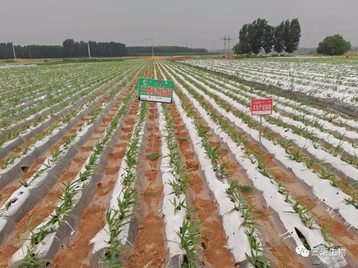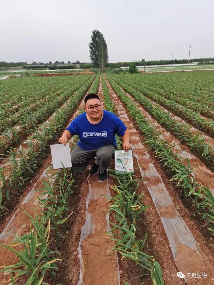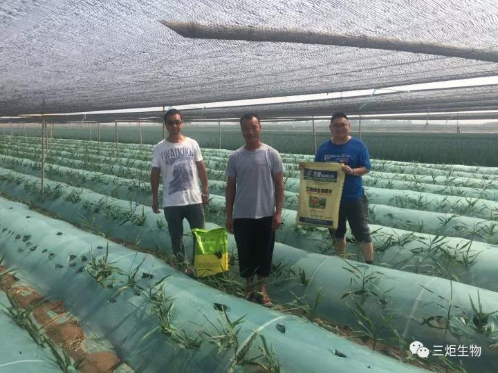 大姜撤膜小培土?xí)r農(nóng)戶及時(shí)施用三炬微生物菌劑。