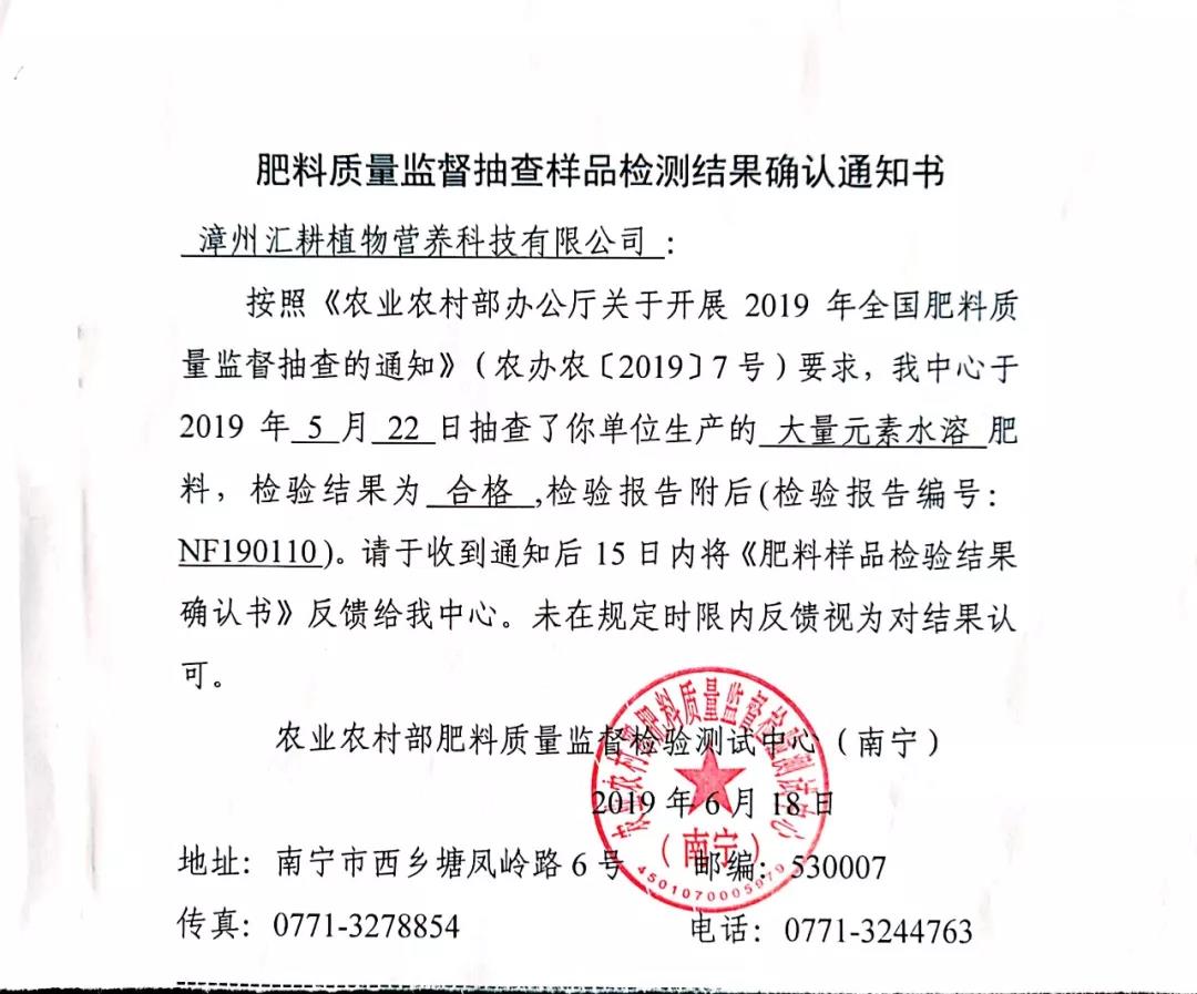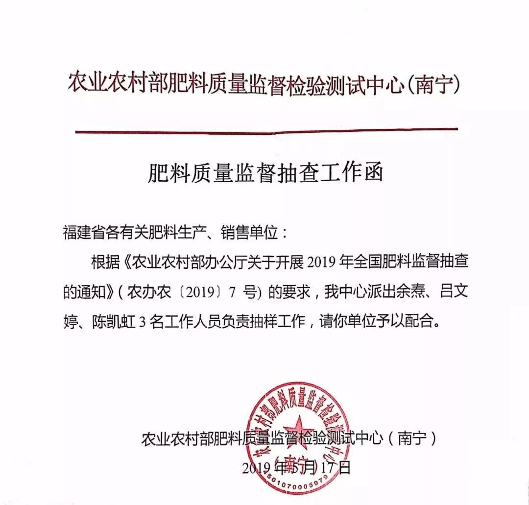 2019年5月22日,農(nóng)業(yè)農(nóng)村部肥料質(zhì)量監(jiān)督檢驗測試中心(南寧)余燾、呂文婷、陳凱虹、省土肥站肥料科付科長、漳州市土肥站丁站長蒞臨“福建三炬”對大量元素水溶肥和有機(jī)肥進(jìn)行現(xiàn)場抽樣,經(jīng)過抽樣檢測均合格?!案=ㄈ妗背闪?2年以來,一直保證產(chǎn)品的“品正質(zhì)優(yōu)”。